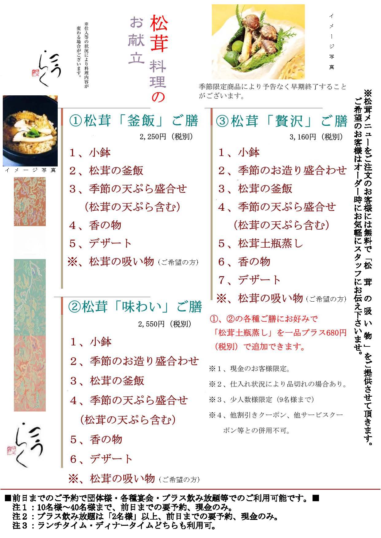 「松茸ご膳」の3千円以上のメニューの予約時の場合、