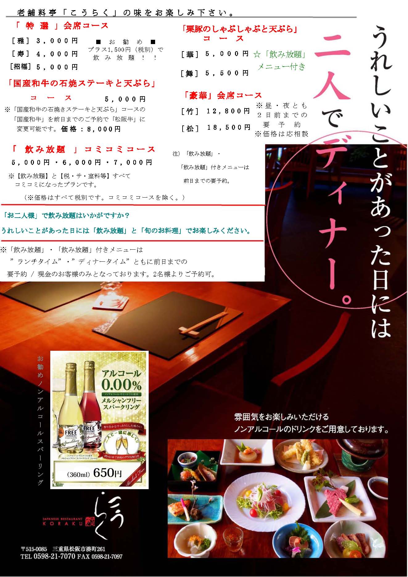 | 1、 こうらく「特選」会席コース |