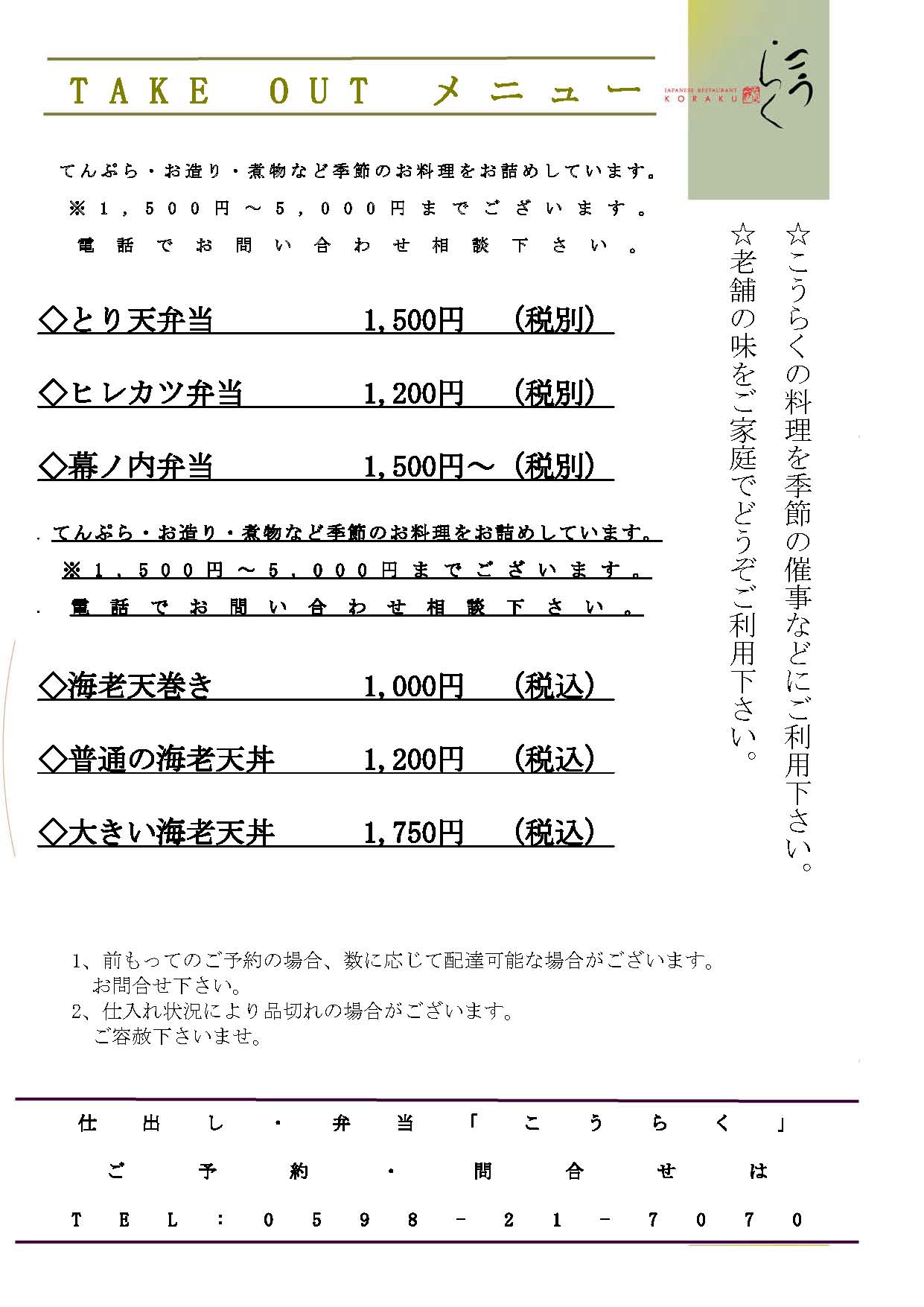 こうらくの料理を季節の催事などにご利用下さい。 てんぷら・お造り・煮物など季節のお料理をお詰めしています。※1,000円〜5,000円までございます。 電話でお問い合わせ相談下さい。