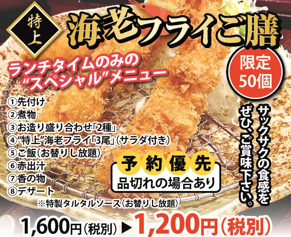 日頃のお客様への感謝をこめて!! 毎月第2、第4の金曜日のランチタイムは ランチタイムの人気メニュー「<特上>海老フライご膳」を特別価格「1,200円(税別)」でご提供させて頂きます。 (限定50個) ※予約優先 注)仕入れの状況により料理内容が変更になる場合がございます。